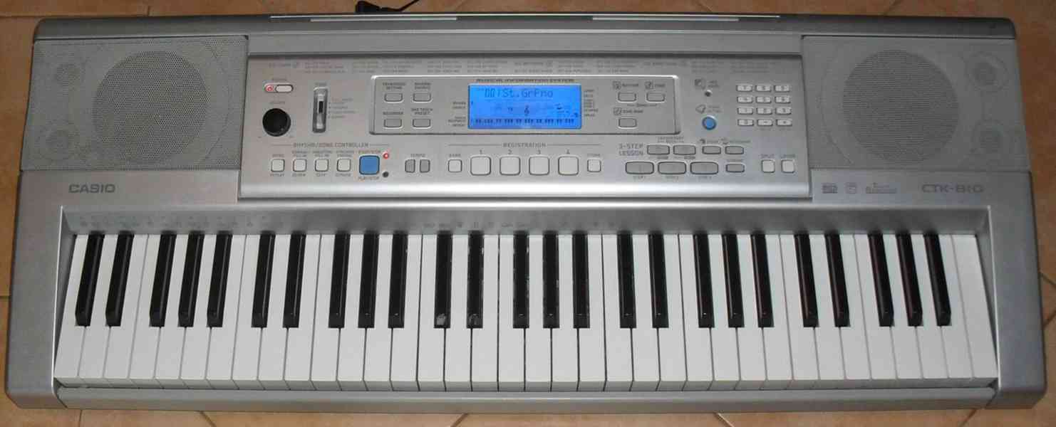 Prodám klávesy Casio CTK 810: 61 kláves s nastavitelnou dynamikou, 32-hlasá polyfonie, 515 volitelných zvuků včetně zvuků standardu GM a 15 bicích sad. Vrstvení zvuků (layer), dělení klaviatury (split), 120 doprovodných stylů s variacemi/fill-in/intro/ending, One Touch Preset pro každý styl, několik možností hry doprovodu včetně akordu jedním prstem, 8 digitálních efektů reverb a chorus, transpozice a jemné ladění, dvoustopá paměť na 2 skladby, 32 registračních pamětí pro uložení všech nastavení nástroje, výukový režim ve třech lekcích, demo skladby a 100 ukázkových a výukových skladeb (posuv vpřed a vzad, pauza, přehrávání ve smyčce A/B), možnost nahrát další skladby do paměti, metronom, tlačítko pro rychlé nastavení zvuku piana. Velký podsvícený displej zobrazuje i prstoklad, notovou osnovu a celou klaviaturu. Rozhraní USB typ B, výstup na sluchátka/zesilovač a možnost připojení pedálu s volitelnou funkcí. Plně funkční, pěkný stav. Napájení na baterie i síťový zdroj (ten mohu přidat za 300 Kč).