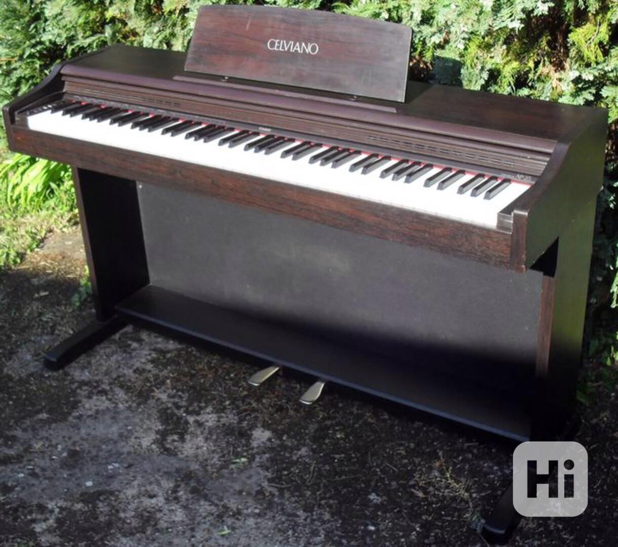 Prodám digitální piano Casio Celviano AP-25: plný klavírní rozsah 88 kláves s kladívkovou mechanikou a nastavitelnou dynamikou, originální stojan se dvěma pedály, odnímatelný stojánek na noty, posuvný kryt klaviatury. Na výběr 8 různých zvuků (4x akustické piano, 2x e-piano, cembalo, vibrafon), 64-hlasá polyfonie, efekty chorus a 4x reverb, transpozice a jemné ladění, metronom, záznam hraní paměti, 8 ukázkových skladeb. Rozhraní Midi IN/OUT, 2x sluchátkový výstup, připojení dvou pedálů (sustain a soft s volitelnou funkcí). Hudební výkon vnitřního ozvučení 2x20W. Plně funkční v pěkném stavu. Osobní předání.