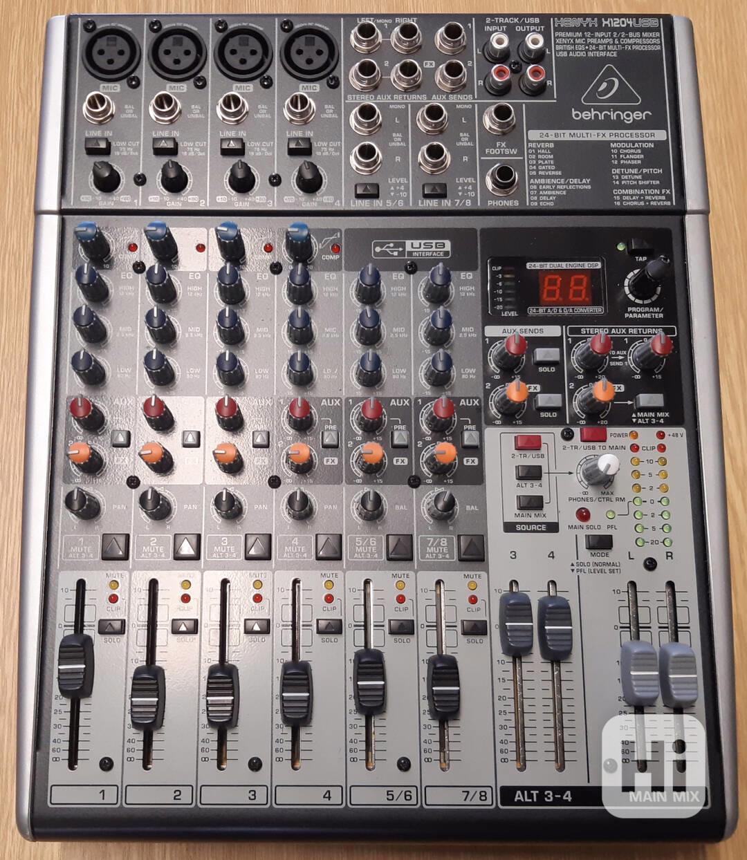 Behringer XENYX X1204USB je 12-kanálový mixážní pult s USB rozhraním a DSP jednotkou. Za pomocí tohoto menšího mixážního pultu můžete snadno ze svého počítače udělat kompletní domácí studio. Obsahuje: 4 mikrofonní předzesilovače, Xenyx 4 linkové stereo vstupy, ekvalizér britského typu, phantomové napájení, Aux1 a Fx send, USB rozhraní, DSP jednotka, Tape In/Out, 60mm fadery, napájení 100-240V. Efekty: Hall, Room, Plate, Gated, Reverse, Early Reflections, Ambience, Delay, Echo, Chorus, Flanger, Phaser, Detune, Pitch Shift, Delay + Reverb, Chorus + Reverb. Zabudovaný ekvalizér. Š. = 27 cm, V. = 9,7 cm, Hl. = 32,8 cm. Hmotnost: 2,5 kg. 100% stav. Používaný pouze krátce ve zkušebně. Cena 3.499 Kč. tel. 797 864 944 email: patmatvm@email.cz
